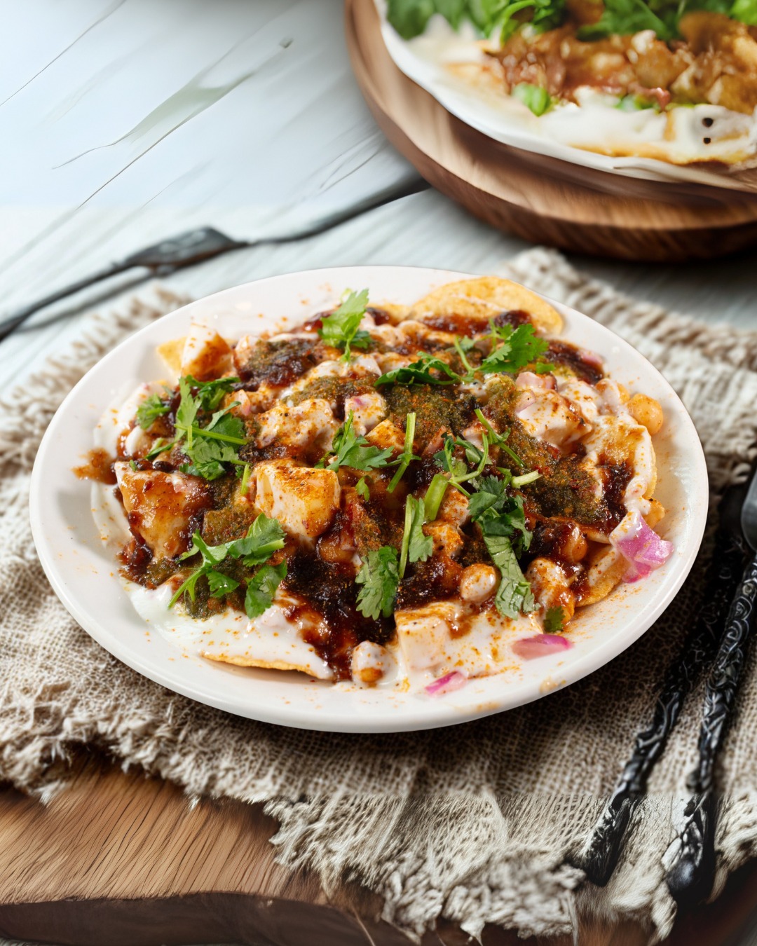 Crispy potato patties, spicy chana topped with tangy chutney and spices.